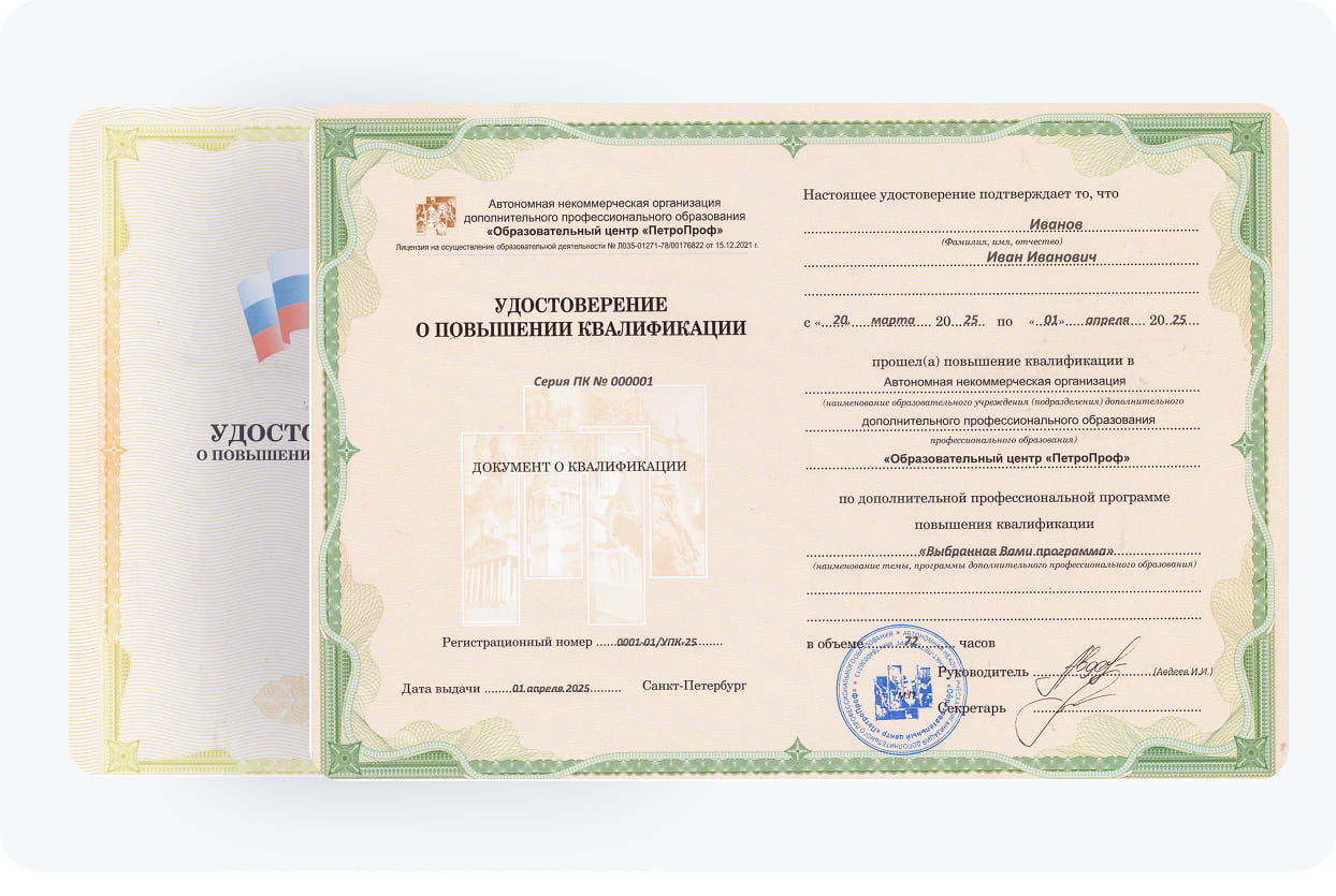 По окончанию обучения все студенты учебного центра "ПетроПроф" получают упк (удостоверение о повышении квалификации), отражающее полученные компетенции и навыки.